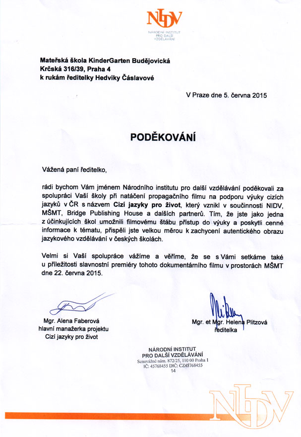 KinderGarten > Anglické školky > Praha 4 Budějovická > Novinky > Národní institut pro další vzdělávání - poděkování