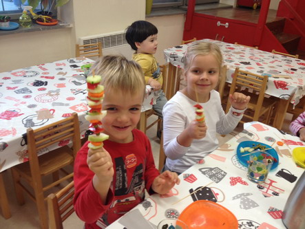 Dnešním tématem bylo "Ovoce a zelenina". Děti si samy dělaly zeleninové špízy.