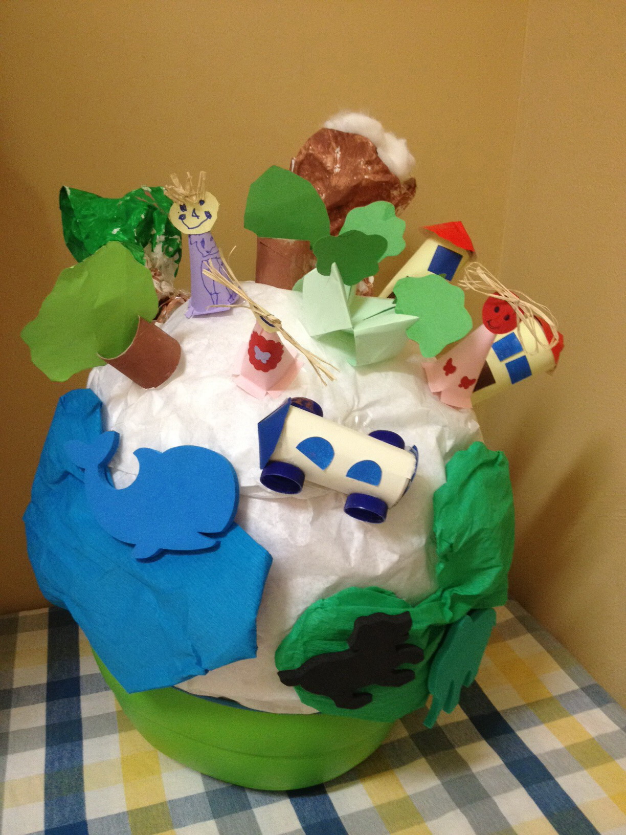 Děti dělaly projekt "Naše planeta a vše co na ní roste". K výrobě planety použily roličky od toaletního papíru a víčka z PET lahví.