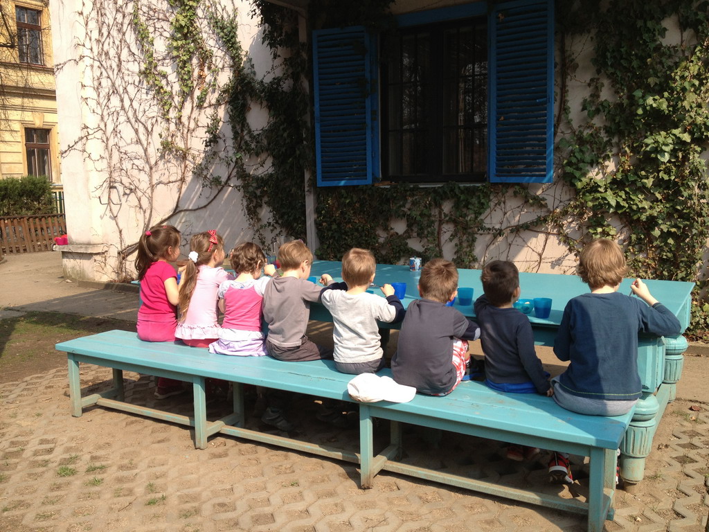 KinderGarten > Česko-Anglické školky > Praha 4 Branik > Den v MŠ > Svačíme venku na zahrádce