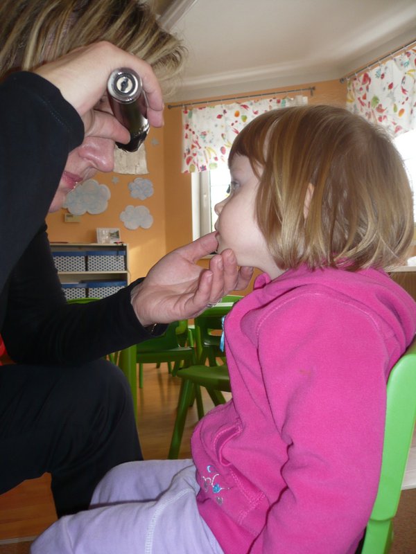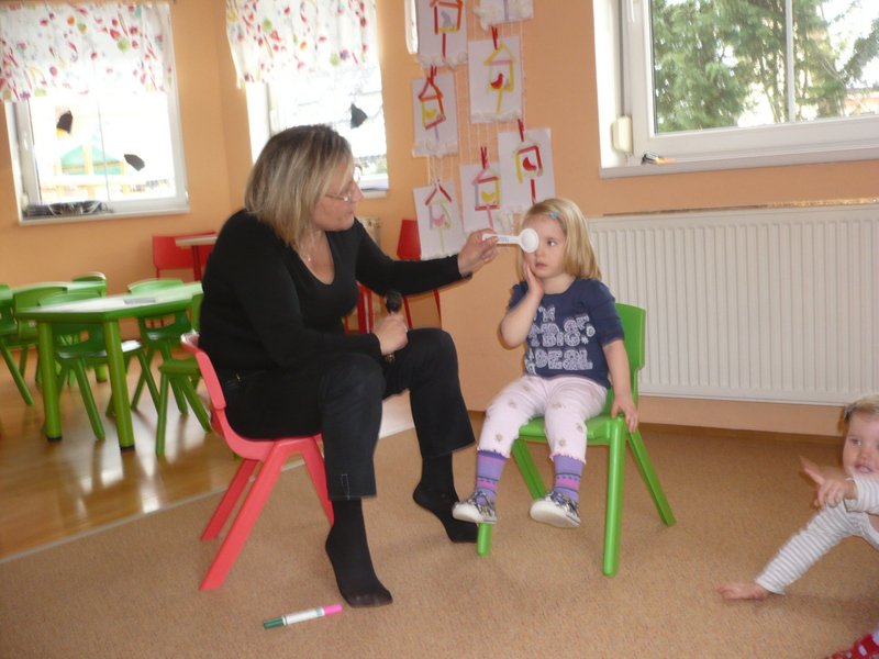 V rámci našich plánovaných preventivních zdravotních prohlídek nás ve středu 20.2. 2013 ve školce navštívila paní doktorka MUDr. Zdeňka Gajdošíková. Provedla nám vyšetření zrakových funkcí do dálky na optotypech, vyšetření pohyblivosti očí, předního segmentu, základních zornicových reakcí a orientační vyšetření očního pozadí oftalmoskopem.